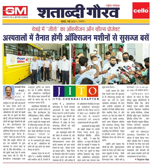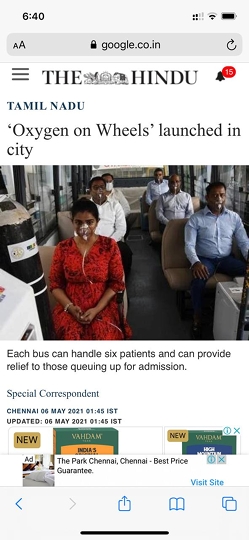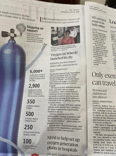 The Jain International Trade Organisation (JITO), in association with the Greater Chennai Corporation, has launched “Oxygen on Wheels’:an initiative where buses laden with oxygen concentrators will be deployed outside government hospitals.